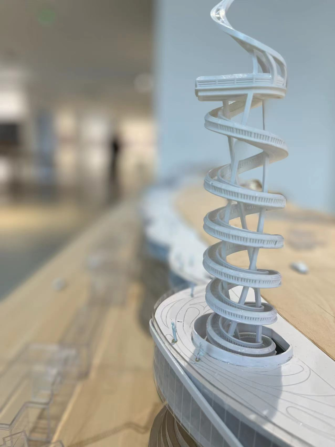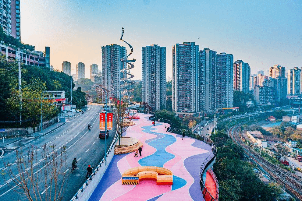 “螺旋天梯”就是出自四川美术学院建筑与环境艺术系黄耘、王平妤、曹丰泰、马思巧、魏雪等老师主创设计的《中岛艺路的城市形象空间设计》项目。