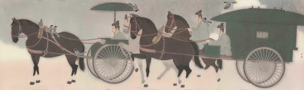 陈品作品《汉唐河风福神州》,绢本设色,灵感来源于汉代画像石《车马出行图》,描绘了平面化并富有装饰意趣的构图,以及古拙有力的雕刻形象,表现了中国古人出行时的场景。画面通过人马鸟之间的相互关系,表现了表现的是人与自然和谐相处的美好场景。