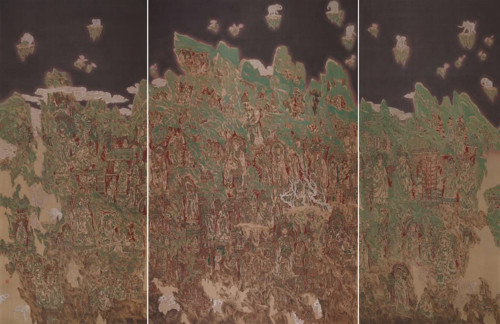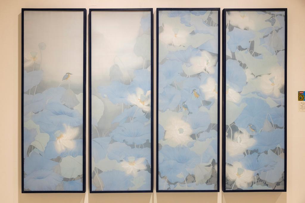 张利的作品《莲华》灵感来源于敦煌莫高窟的文化遗产艺术,通过画面表现出动物森林之间生生不息的氛围,营造出一种盛世祥、太平吉祥的含义。色彩吸收了敦煌壁画重彩的效果,是当代中国画探索创新的重要方向。