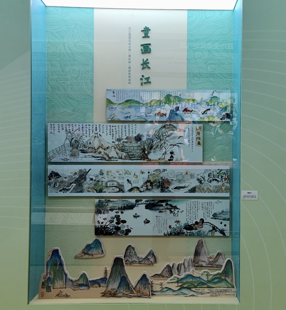 在“童画长江”展墙上,四名重庆小学生描绘的长江图画以通柜形式呈现。孩子们的笔触中,有的再现了生活在长江中的可爱生物,有的记录了长江流域生态环境改善带来的积极效益,不仅体现出对自然的敬畏,还有对生活的热爱。