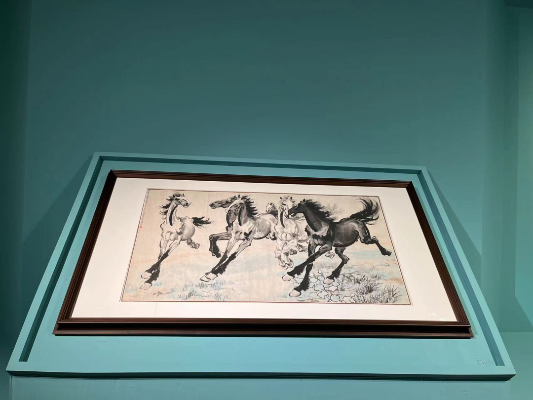据介绍,《群奔》是徐悲鸿先生1942年在重庆创作的,其将西洋画的笔触跟传统没骨画法相结合,运用饱酣奔放的墨色勾勒头、颈、胸、腿等大转折部位,并以干笔扫出鬃尾,使浓淡干湿的变化浑然天成,让马腿的线条刚劲有力,力透纸背,而腹部、臀部及鬃尾的弧线,则很有弹性,富于动感。