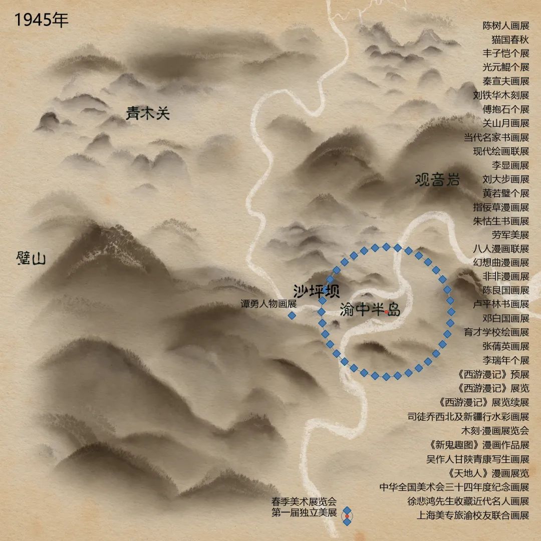 艺术地图展览从“艺术地理学”视角切入,重点观照重庆特殊的空间、地理、人文与本时期美术院校、艺术家、艺术作品、美术展览、美术报刊、社团之间的互动共生关系。以重庆地图为蓝本,运用 GIS 系统呈现可视化艺术地图,为重庆版图上的中国现代美术提供一种既可身临其地,又可远观沉思的在场与感知方式。