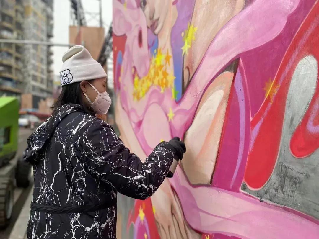 An artist is painting in Huangjueping Graffiti Art Street. (Photo/ Jiulongpo District)