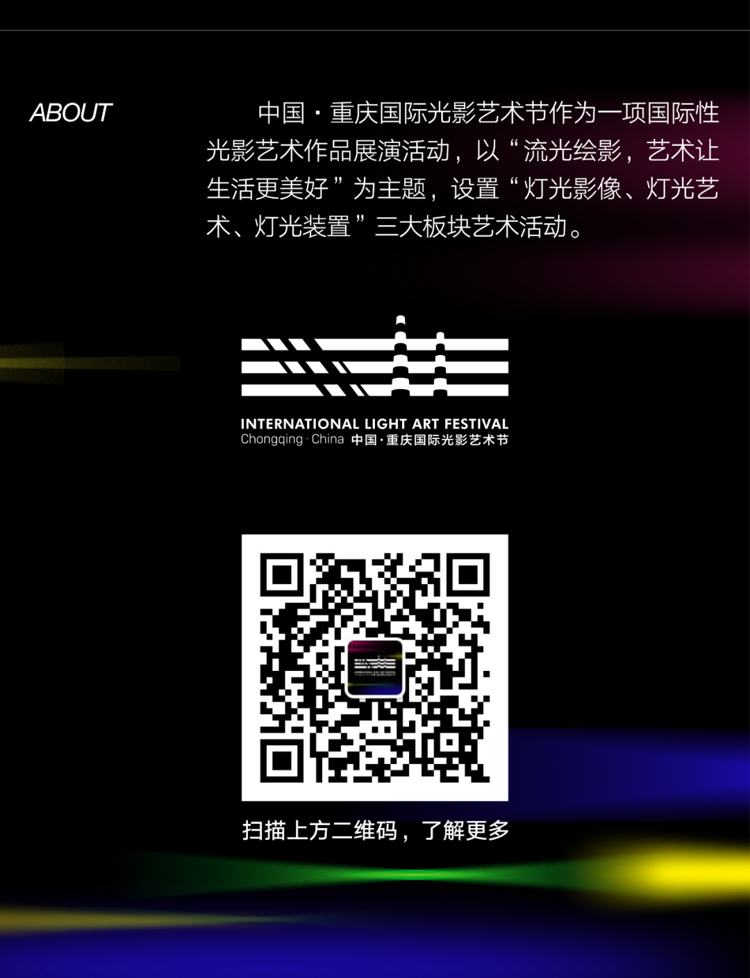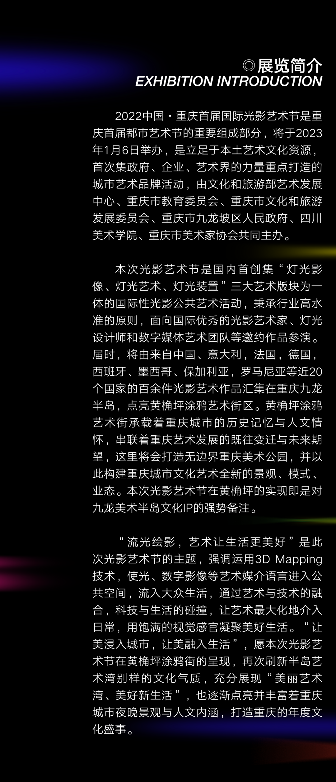 光影艺术节是四川美术学院艺术赋能社会,在新文科背景下聚焦“艺术+科技”,提升重庆辨识度、打造城市烟火气、提振都市旅游信心,塑造文化精品,推出的国际性光影艺术活动。