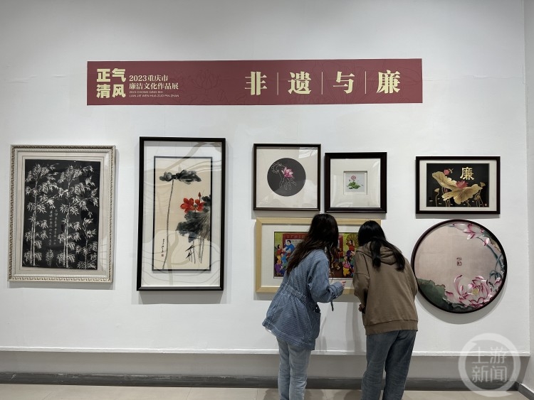 漫步整个展厅,记者看到,展出作品中有的通过诙谐幽默的方式深刻讽刺了贪腐,让人在开心一笑的同时也会自然地收获警示;有的则是将廉洁文化主题同剪纸、刺绣等各色非遗进行了巧妙的融合,让观众竖起大拇指直呼好美的同时,也对清廉二字有了更深的印象。