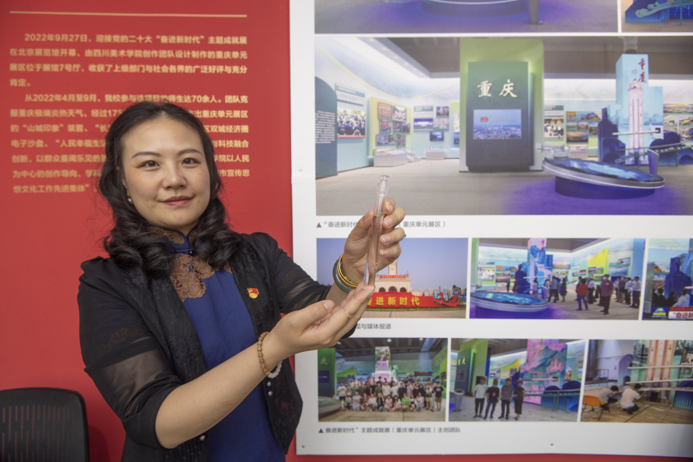 ▲5月4日,四川美术学院五四主题团日活动,“奋进新时代”主题成就展(重庆单元展区)主题创作团队成员在介绍怎样将清澈的长江水融入设计装置作品中。记者 郑宇 摄/视觉重庆