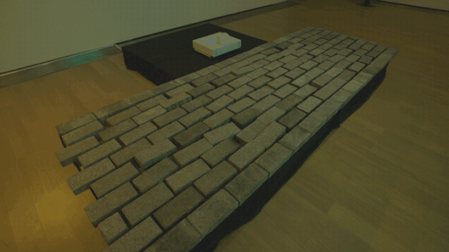 作品名称:《路》作者:李凯、刘嘉辉、印其灵、苏文迪类别:装置尺寸:350cm×140cm×50cm材料:砖块、舵机、ESP32扩展板、变压器、铝型材、固定装置、木板 、投影仪、KINECT、路由器、电脑创作年份:2023年