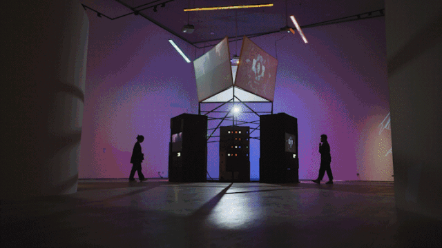 作品名称:《拟态窗口》作者:许善泓、李传刚、徐陆麟、付佳慧、邹明池类别:装置\游戏尺寸:750cm×745cm×700cm材料:木质箱体、屏幕、钢架、灯、投影创作年份:2023年