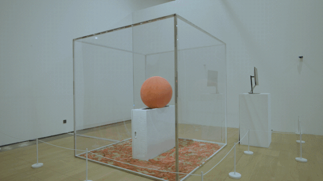 作品名称:《嘘,会爆》作者:刘衎衎类别:装置尺寸:220cm×220cm×220cm材料:不锈钢框架、透明膜、显示器、气球装置、空压机、电脑创作年份:2023年