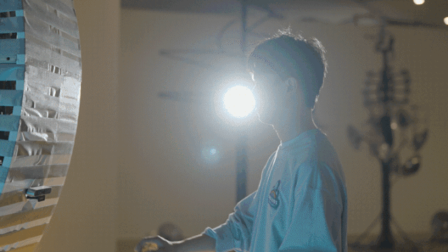 作品名称:《Delta》作者:郑豪、冯佳睿类别:装置尺寸:230cmcm×230cmcm×20cm材料:钢制圆环、无刷电机、控制电路、氨纶布创作年份:2023年