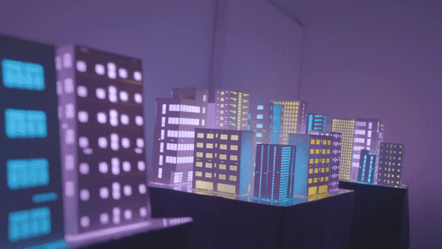 作品名称:《城》作者:田璐、郑莉娟、包青石、黄振宇、张海湘类别:装置尺寸:550cm×550cm×450cm(单个尺寸:80cm×80cm×150cm×4个)材料:舵机、单片机、LED、路由器、Kinect、铝型材创作年份:2023年