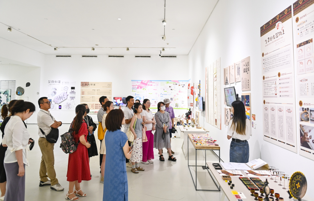 在设计学院展厅,作品围绕“绿色设计、乡村振兴、文化传承、数智生活、生命安全”五大主题,以有宜、有度、有效的实践,探索了新的理念、范式与路径,呈现出设计的多元价值与内涵。