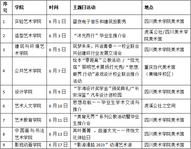 除观看展厅陈列的毕业作品外,观众还可在“开放的六月”期间参与由川美9个二级学院轮值举办的“特色主题日”特色活动,具体安排如下>>>