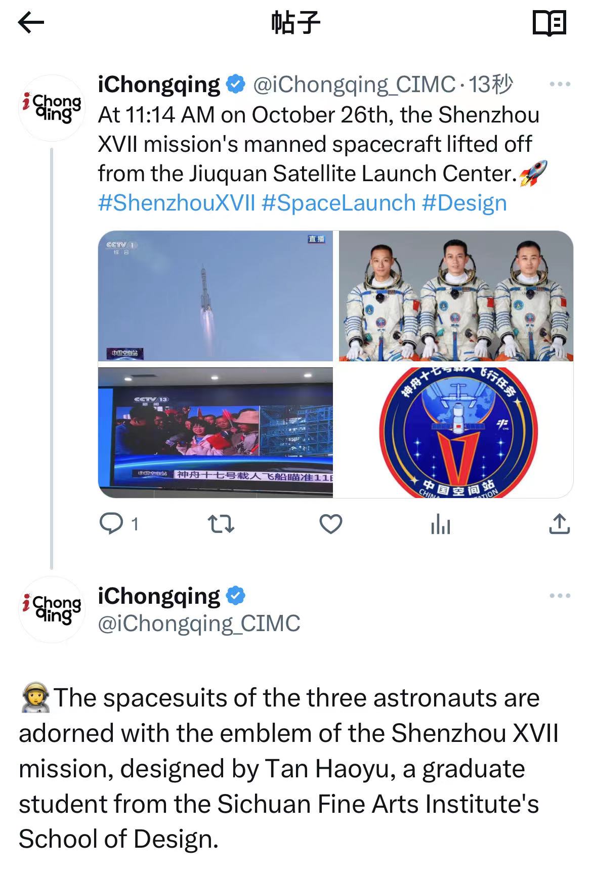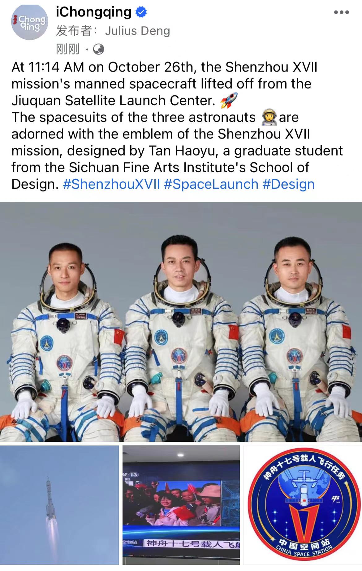 At 11:14 AM on October 26th, the Shenzhou XVllmission's manned spacecraft lifted off from theJiuquan Satellite Launch Center.The spacesuits of the three astronauts oareadorned with the emblem of the Shenzhou XVllmission, designed by Tan Haoyu, a graduate studentfrom the Sichuan Fine Arts Institute's School ofDesign.