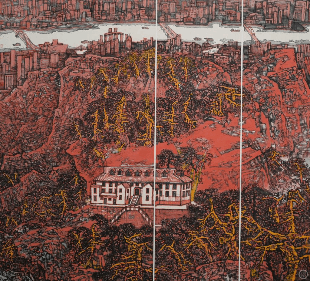 在国画板块,红岩精神是最突出的主题:印刻在红岩革命烈士巨石上的《狱中八条》振聋发聩;陡峭的山崖间,革命旧址隐于红色背景之下,远处是高楼耸立的现代化重庆,红岩精神的光芒不朽。