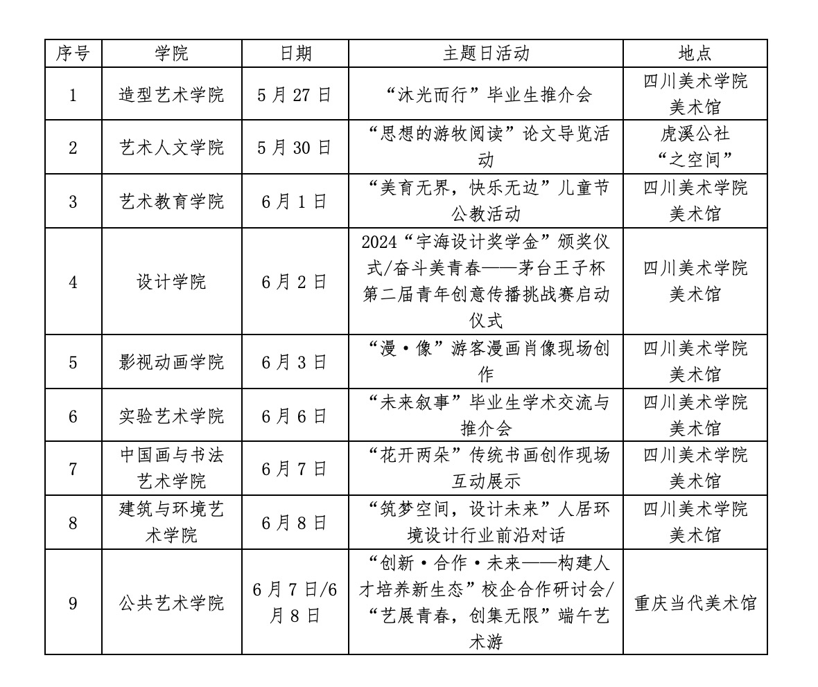 除展厅陈列的毕业作品外,观众还可在“开放的六月”期间参与由川美9个二级学院轮值举办的“特色主题日”特色活动。市民即日起可免费前往观展。请关注四川美院美术馆公众号参观须知,提前预约入馆。