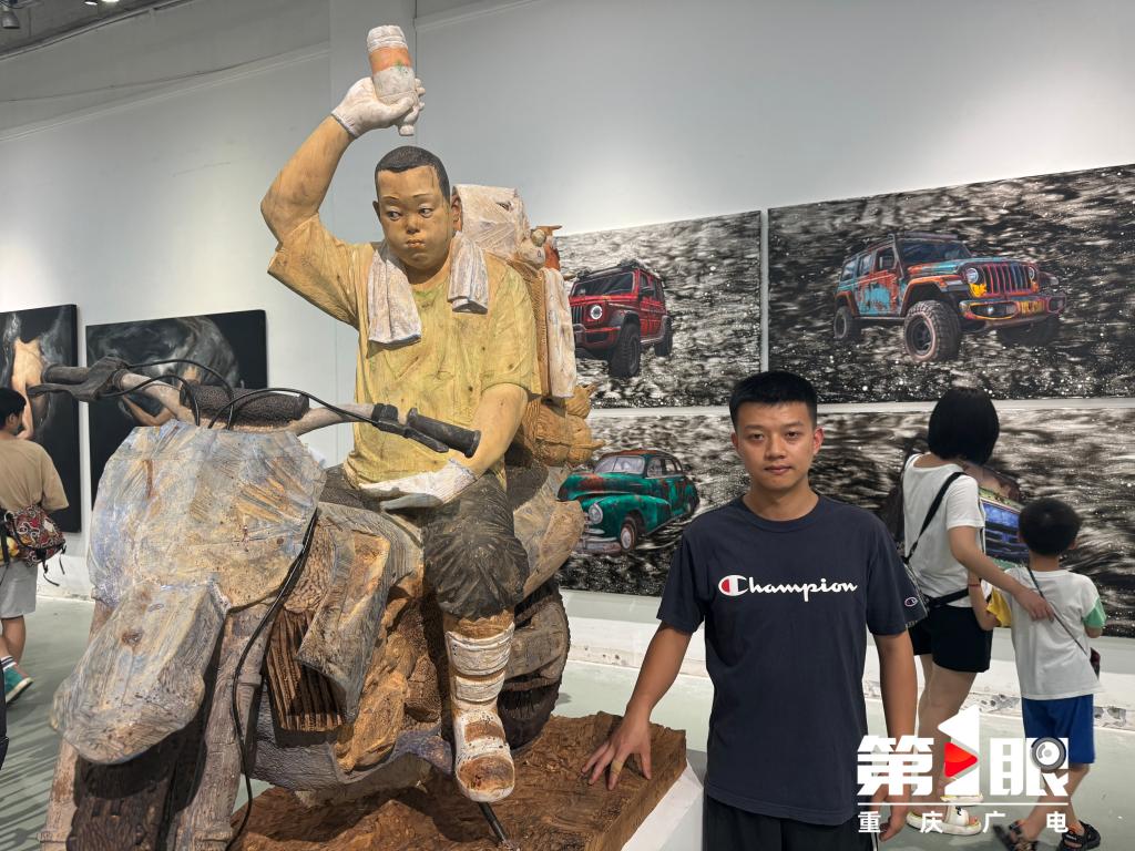造型艺术学院硕士研究生苏小林的作品《烈火骑士——龙麻子》,通过木雕的形式,再现了2022年夏天重庆山火中的生动形象,“它汇聚了我们所有重庆人民的一个力量,把当时人民对这种家国情怀的担当表现出来,同时通过这件作品,也想对我们全国各地参与这场救援事件的人民,表示莫大的敬意”,作者苏小林给第1眼新闻记者介绍到。