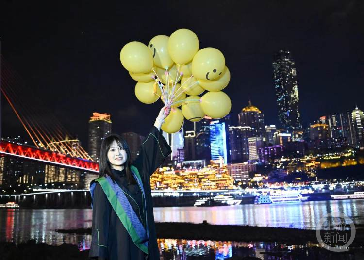 而在千厮门大桥下的江滩上,近百名身着学士服的川美2024届毕业生则是一片欢腾,争相和这一特别的背景合影,为自己大学生活的最后一刻定格。