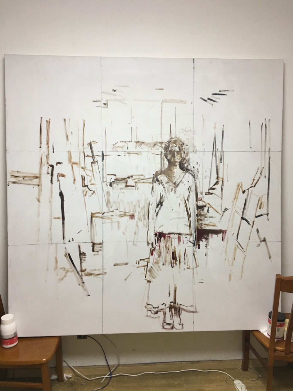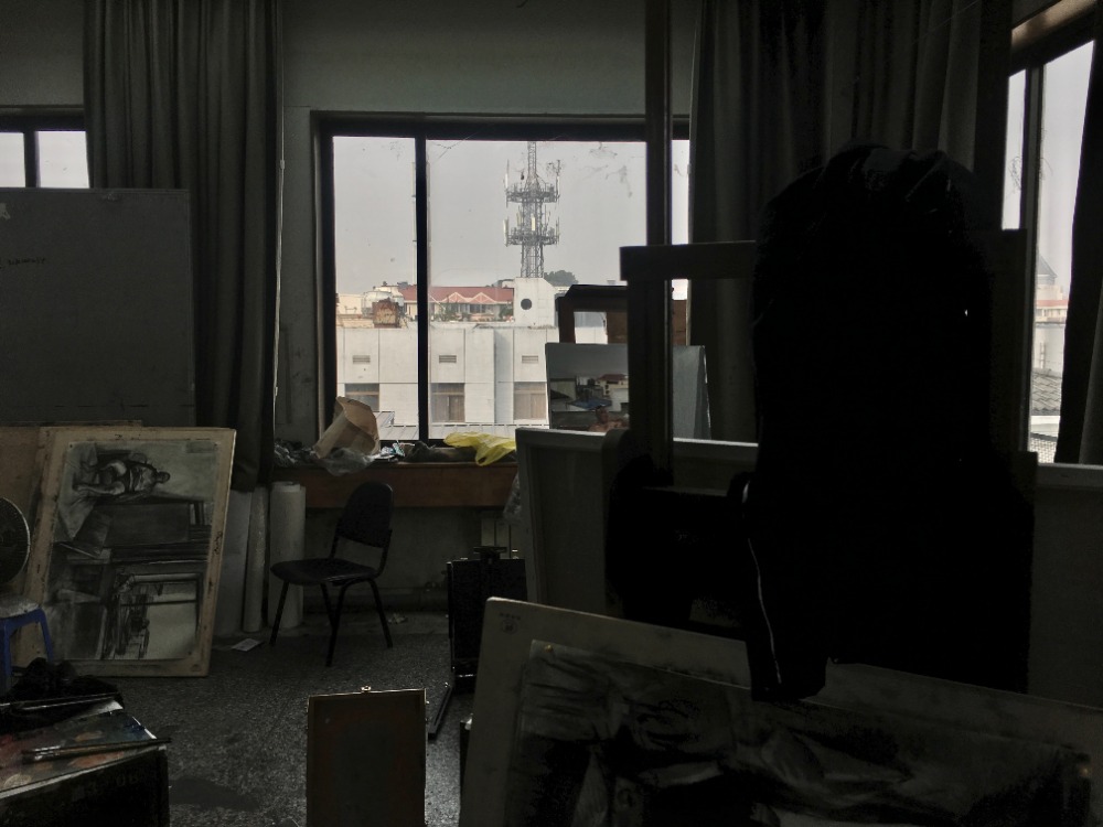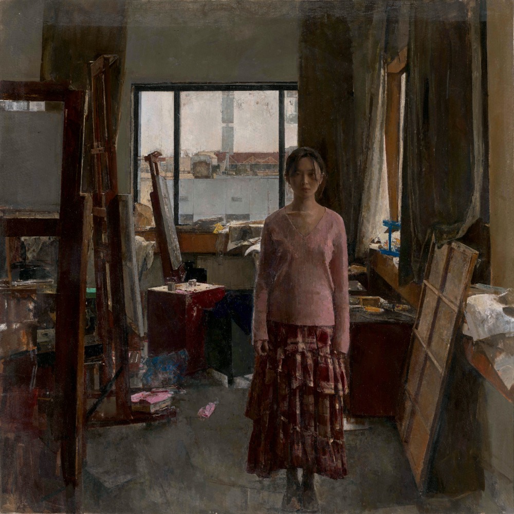 该作品表现的场景,是他每天上课与工作的画室。在选取素材时,他尽可能地保留了现场原有的布置,包括画架、画箱、书籍等,都维持着平日里的秩序和位置,未经刻意调整。唯一对模特(画中,一位女性肖像)的位置进行了设计,使其处于画面中黄金分割点上,以一种对称而挺拔的姿态呈现。