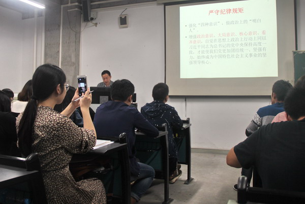 会上,陈德洪组织全体党员就“纪律”和“情操”两大关键词展开专题讨论,以经典红色美术作品回顾党的发展历程,学习了《中国共产党问责条例》和《中国共产党廉洁自律准则》,并对当代大学生提出了以下要求:在生活和学习中要发挥党员先锋模范作用;积极推动文化建设,尊重文化艺术发展规律;要强化“四种意识”,在政治上严加要求,严守党的纪律,要做政治上的“明白人”;保持高尚情操等。最后,师生党员围绕“严守纪律规范,培养高尚情操”专题积极发言,进行了热烈的讨论。