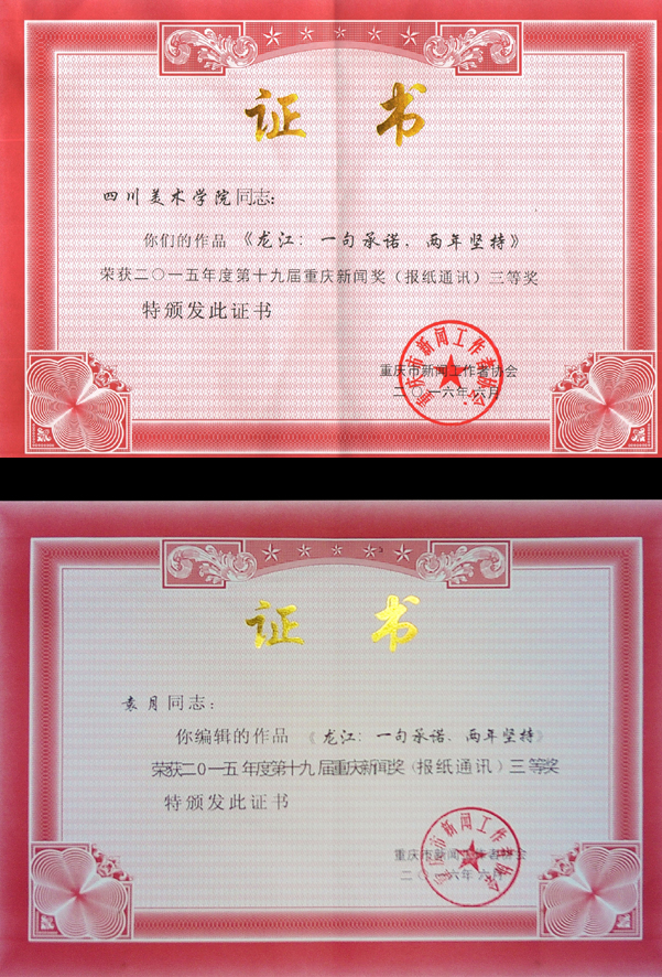 近日,在第十九届重庆新闻奖和2015年度中国高校校报好新闻评选中,我校校报《四川美术学院报》多件作品获奖。其中,在重庆市新闻工作者协会主办的重庆新闻奖评选中,《龙江:一句承诺,两年坚持》(李霈箐、刘禹杰、张啸晗、赵迎昭)获得报纸通讯类三等奖,该作品同时还获得编辑奖。在中国高校校报协会主办的中国高校校报好新闻评选中,校报第278期第02版(袁月编辑)获得版面类二等奖;《创业,是梦想而非潮流》(李霈箐)获得言论类二等奖;《天气正好 下地干活》(杨勇)获得摄影类三等奖;《龙江:一句承诺,两年坚持》再获通讯类三等奖。