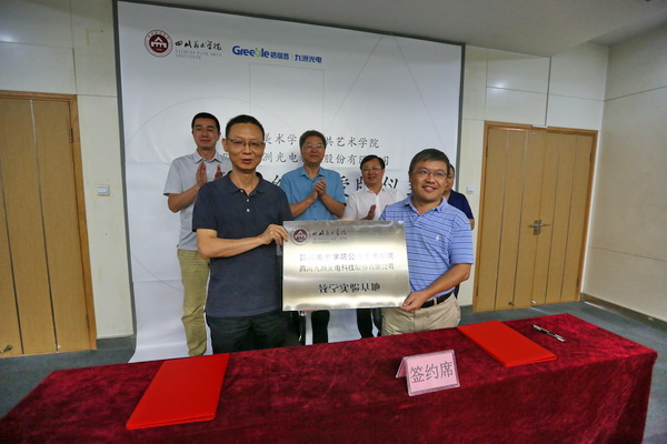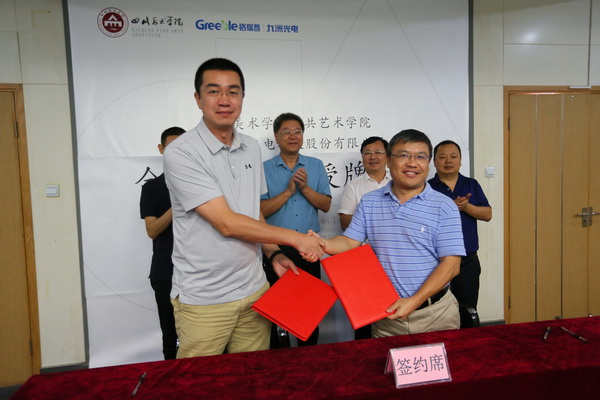 仪式首先由九洲集团总经理助理刘定林和我校郭晏麟分别介绍双方基本情况。随后,郭晏麟代表公共艺术学院与九洲光电董事长谢拥军签订了战略合作协议,钟正武向九洲光电授牌。双方同时就合作意义、合作模式、执行进度进行了深入交流并达成共识,此次合作应充分发挥我校艺术设计的育人优势,以及企业产能转化的科技优势,实现艺术与技术的紧密结合,从而进一步推动艺术创作与市场经济的有力对接。