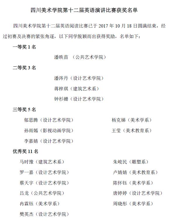 10月18日晚,“四川美术学院第十二届英语演讲比赛”落下帷幕。本次英语演讲比赛历时两周,经过第一轮初赛的激烈角逐,从八十多位参赛选手中选拔出二十位进入到决赛阶段。在10月18日的决赛中,20名来自不同院系、特色各异的选手在本次比赛中一展风采,给评委和观众带来了一场视听盛宴。比赛中,选手们端庄大方的仪表、纯正地道的语音以及激情澎湃的演讲,展示了良好的英语演讲水平和较强的临场应变能力,得到了评委老师的高度认可和全场观众的热烈掌声。经过命题演讲和即兴演讲两个环节的比拼,来自公共艺术学院的2016级本科生潘昳苗同学荣获演讲比赛一等奖,同时也获得了通往重庆市第27届大学生英语演讲比赛的通行证,一同代表学校参加重庆市英语阅读比赛和写作比赛的还有获得校级阅读比赛一等奖的公共艺术学院的2017级本科生张建颖,以及获得校级写作比赛一等奖的雕塑系2015级本科生郁夕梓。