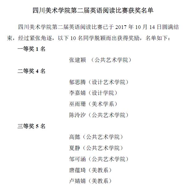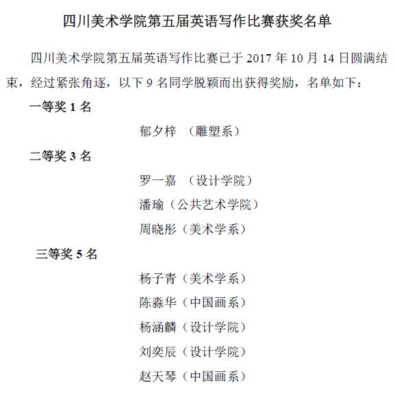 一直以来,我校对于学生的英语实际运用能力都高度重视,除了课堂教学以外,还积极开展课外拓展延伸的英语活动和英语比赛,用活动串起同学们的英语课外学习之旅。今年我校顺利举办了“四川美术学院第十二届英语演讲比赛”、“四川美术学院第二届英语阅读比赛”以及“四川美术学院第五届英语写作比赛”,统称为“四川美术学院U-Challenge”三大比赛。川美英语的三大比赛旨在激发同学们学习英语的积极性,营造英语学习的良好氛围,并为“重庆市大学生英语演讲比赛暨外研社杯全国英语U-Challenge三大比赛”选拔出最优秀的选手,代表我校参赛。