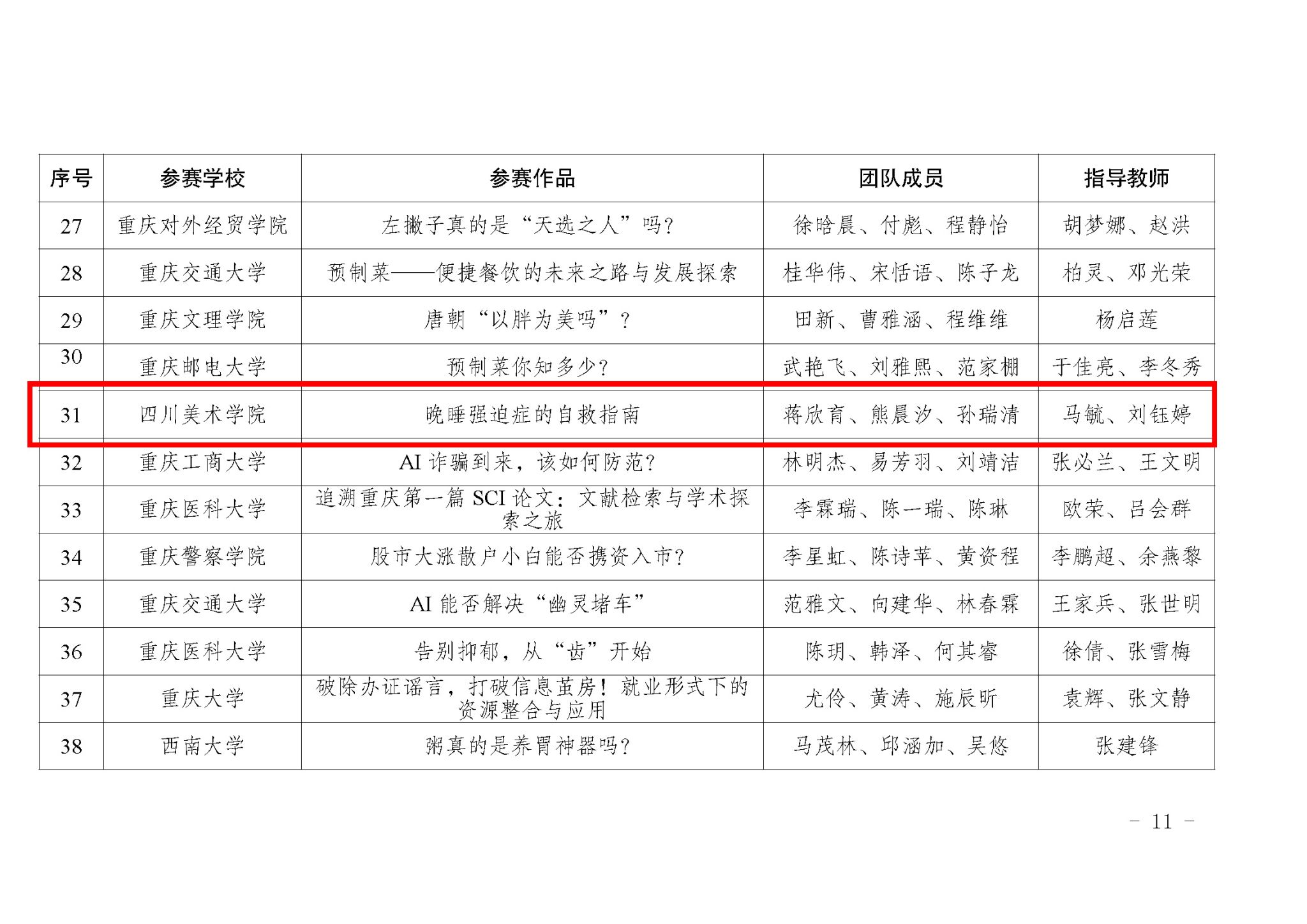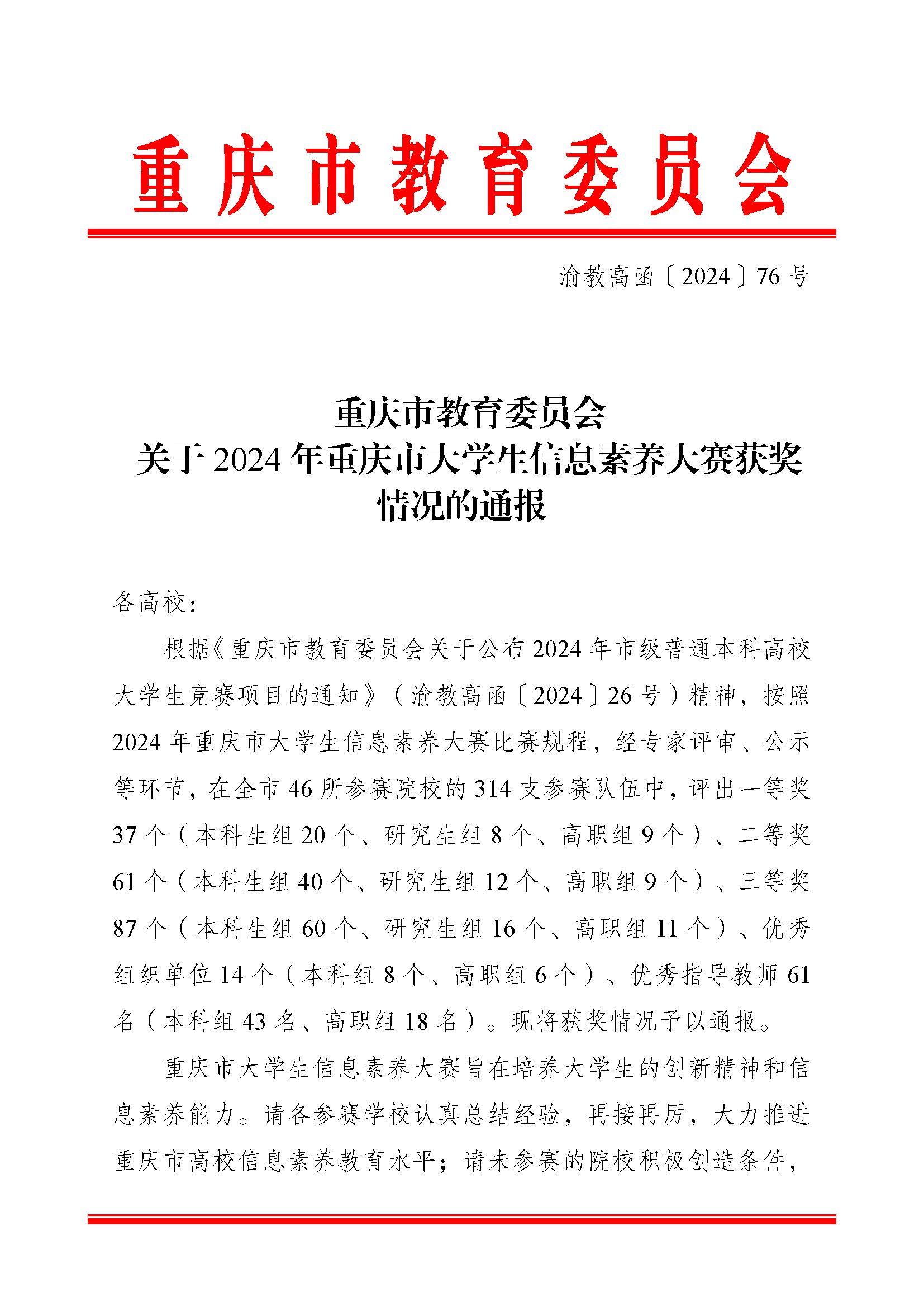 近日,重庆市教育委员会发布《关于2024年重庆市大学生信息素养大赛获奖情况的通报》(渝教高函〔2024〕76 号),由我校图书馆组织、指导的学生团队荣获本科生组三等奖。