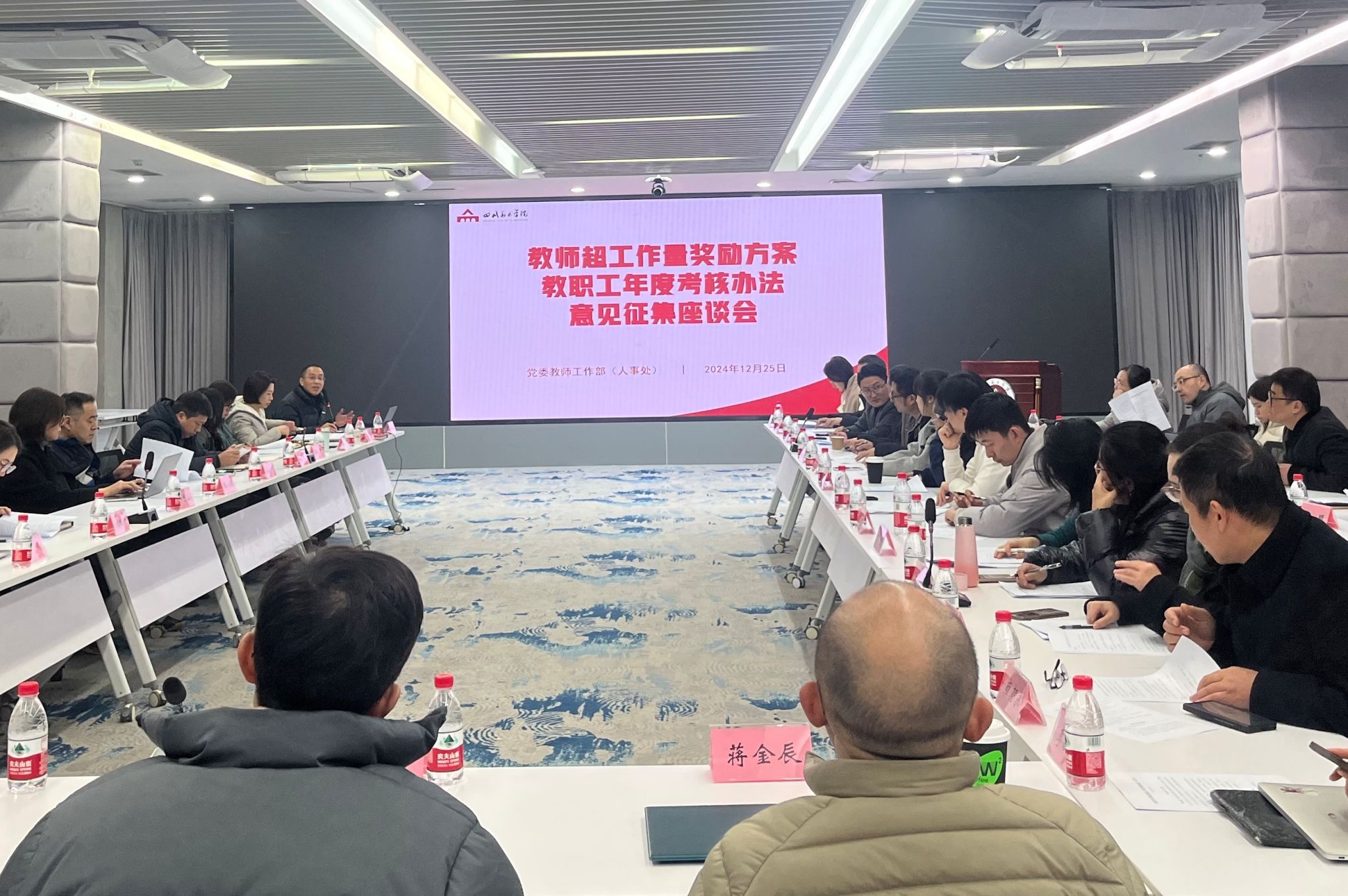 12月25日,人事处在虎溪校区组织召开四川美术学院教师超工作量奖励方案及教职工年度考核办法意见征集座谈会。学校二级教学科研单位主要负责人、相关职能部门主要负责人、教师代表、各单位职工代表参加会议。会议由人事处负责人主持。