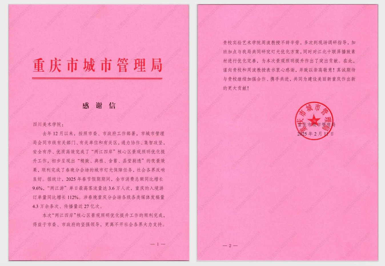 近日,重庆市城市管理局向我校发来感谢信,感谢我校对“两江四岸”核心区景观照明优化提升工作的大力支持,同时对实验艺术学院教授周波的工作表现予以高度赞扬,期待未来能继续与我校携手共进,为建设美丽新重庆作出新的更大贡献。