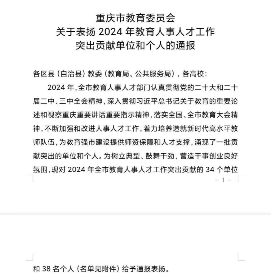 近日,重庆市教委发文通报表扬2024年在全市教育人事人才工作中做出突出贡献的单位和个人。我校人事处获得“2024年全市教育人事人才工作突出贡献单位”。