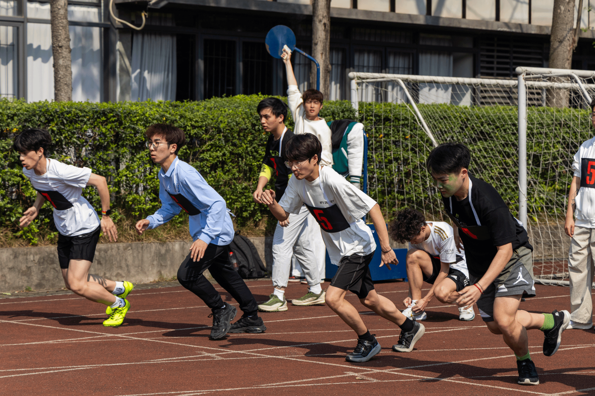 径赛,是速与美的共舞。师生运动员们起跑时蹲踞如压缩的弹簧,冲刺时脖颈绷出青筋,脚步与跑道摩擦出细碎的声响。接力区里精准递棒的手势,是无数次训练磨合的肌肉记忆;弯道超车时摆臂的角度,藏着胜负毫厘的决断。终点线前的欢呼,是师生切磋中编织出的温暖纽带,是团队协作中凝聚成的合作桥梁。