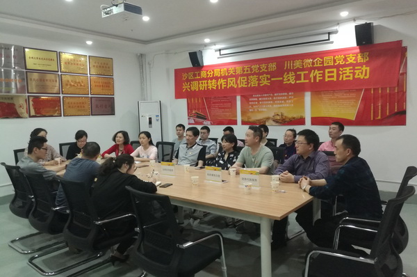 沙区工商分局一行同志深入园区企业进行了走访调研,随后在微企园党员活动室开展交流学习会。微企园党支部书记陈麟首先就大学生微企园的发展历史、现状及将来的发展向工商分局支部党员同志们进行了详细介绍,表示我校大学生创业工作希望继续得到工商分局的大力支持与指导。工商分局第五党支部书记杨晓华表示会加大对我校大学生创业工作的支持和指导。