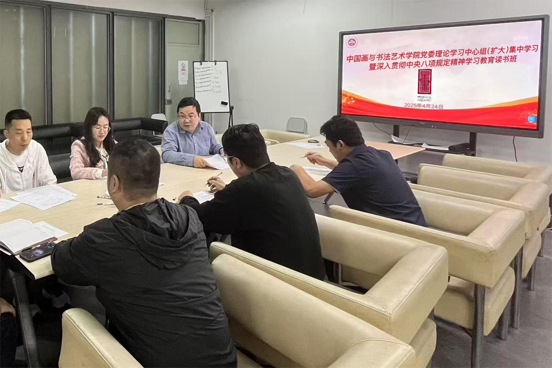 4月28日,中国画与书法艺术学院在学院会议室举办党委理论学习中心组(扩大)集中学习暨深入贯彻中央八项规定精神学习教育读书班第二次专题学习。