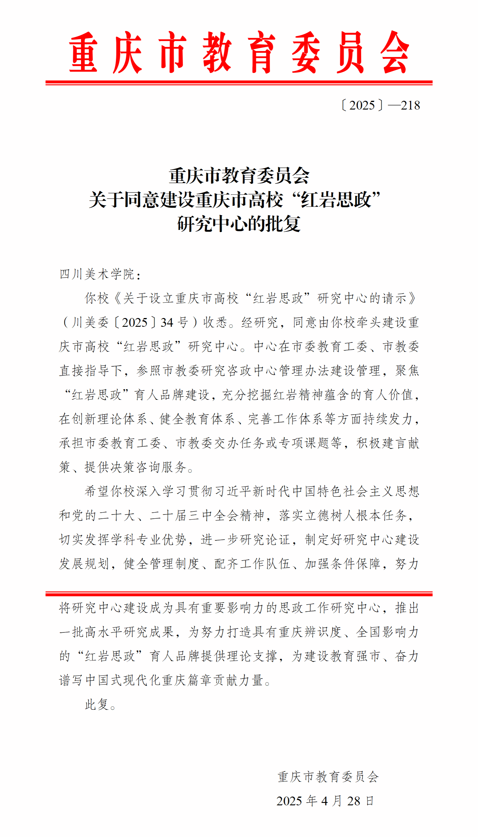 近日,根据《重庆市教育委员会关于同意建设重庆市高校“红岩思政”研究中心的批复》(〔2025〕—218),同意我校牵头建设重庆市高校“红岩思政”研究中心。