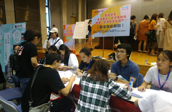 为迎接2018级新同学顺利入学,美术学系举行了为期三天的迎新活动。9月6日上午,来自全国各地的美术学系90名新生来到我校多功能厅报到现场办理入学手续。迎新现场秩序井然,美术学系领导、办公室管理人员及学生会的同学热情地为新生及家长答疑解难,提供帮助。同时,美术学系今年依然为新生提供了四年学习书目,以便同学们尽早适应系科特点,有针对性地学习。