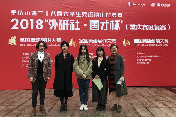 范子潇同学获得2018“国才杯”重庆市阅读比赛二等奖及2018“国才杯”重庆市写作比赛三等奖。周昱伶同学获得重庆市第二十八届大学生英语演讲比赛三等奖。卢婧婧同学获得2018“国才杯”重庆市写作比赛三等奖。