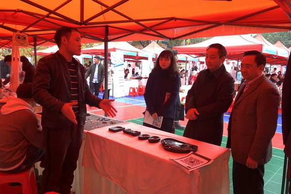 重庆市大中专毕业生就业指导中心余跃主任莅临展洽会现场指导。他依次走访了重庆零玖陶瓷工艺品设计有限公司、重庆寨上文化传播有限公司、漆艺术产品工作室、重庆河东健力雕塑艺术有限责任公司等公司(团队),亲切了解各位创业大学生的现状和问题,并鼓励创业大学生们继续努力为社会创造更多有价值的东西。