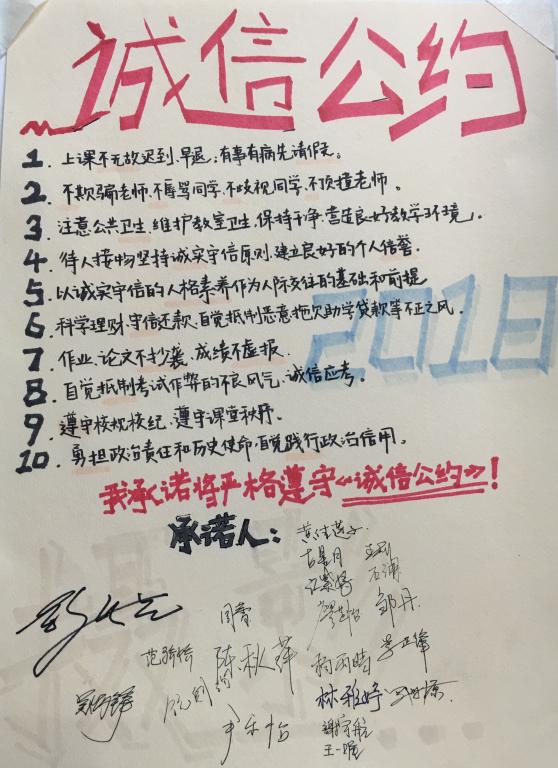 第一,召开主题班会,鼓励同学们制作诚信公约,并在教室张贴,成为人人看得见的行为准则;第二,12月4日至6日,由新媒体艺术系团总支、学生会策划了“四川美术学院新媒体艺术系‘人人知诚信、人人讲诚信’诚信教育主题有奖竞答”网上答题活动,该活动针对全系学生进行全覆盖,题目内容包括了学生手册学生行为规范和国家助学贷款等内容,并对成绩排名在系前10%的同学进行了奖励;第三,12月6日,新媒体艺术系召开全系教职工大会,向全系教职工通报了《关于开展大学生诚信教育主题活动的通知》,系党总支书记聂玉红要求全系教师将诚信教育活动融入到课堂教育活动中,并要求各班班主任开展形式多样、生动活泼的主题教育活动,将大学生诚信教育常态化。