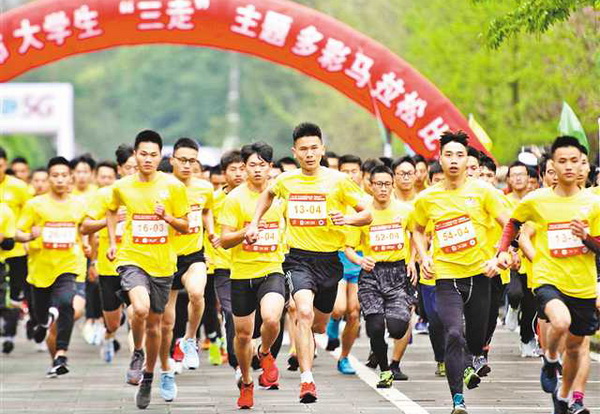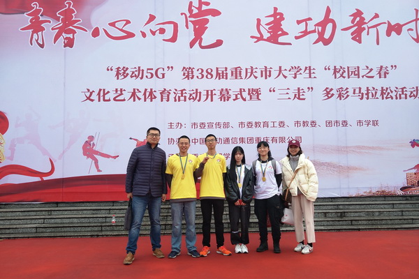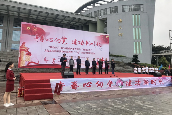 3月23日,由市委宣传部、市委教育工委、市教委、团市委、市学联联合举办的第38届重庆市大学生“校园之春”文化艺术体育活动开幕式暨“走下网络,走出宿舍,走向操场”多彩马拉松比赛在重庆文理学院举行。来自56所高校的参赛团队和青年大学生代表1000余人参加活动,全市5万余名青年大学生通过网络直播观看活动。我校师生代表队参加了开幕式以及多彩马拉松比赛。
