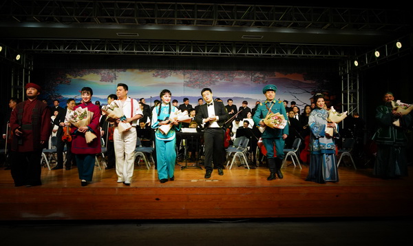 演出结束后,学生代表上台为演职人员献花。校领导上台与演员们一一握手,向湖北省歌舞剧院的倾情演出表示感谢,并与全体演职人员合影留念。