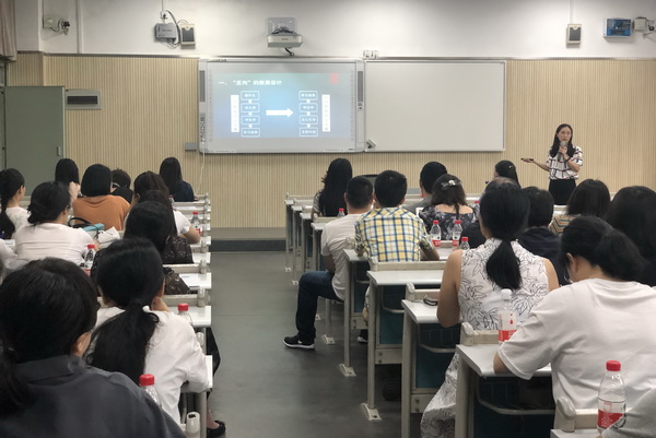 培训上半场,万老师从“金课”特质“两性一度”切入,以自己所授核心课程“大学国文”为例,热情分享了自己多年积累、摸索出的教学设计经验,主要包含四部分主要内容,即教学设计、充分了解和尊重学生学情、从学生视角进行教学环节设计、学习评估贯穿始终,并对应学习目标。她首先提出以成果为本的“反向”的教案设计,将传统的“教什么-怎么教-学生学-学习成果”逆转为“学习成果-学生学-怎么引导-支持内容”,以此来真正做到以学生为中心;其次,结合课程培养目标,逐步分解总目标,从知识、能力、素质三个层次增强教学效果,为了能让现场老师更好的参与、感受“反向”教学设计的优势,发起互动环节,现场老师热烈参与,分组探讨激发学生知识、能力、素质目标的措施,并积极主动交流心得;最后,回归本次培训目标,强调围绕“两性一度”引领教学设计的重要性。万老师专业、深入、丰富的教学经验及其充满人文关怀的情感教育,使在场老师们深受启发。