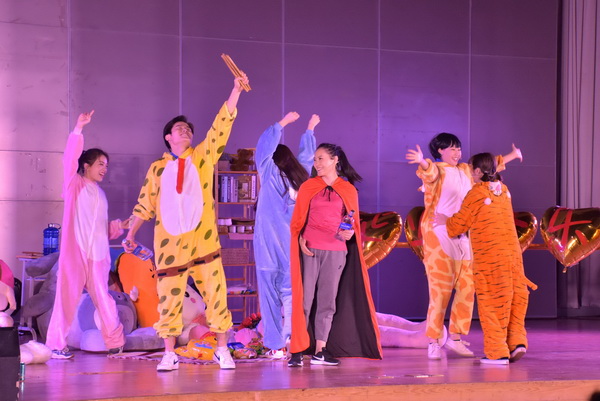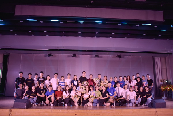 演出结束后,学生代表上台为演职人员献花。我校领导上台与演员们一一握手,向四川外国语大学的倾情演出表示感谢,并与全体演职人员合影留念。