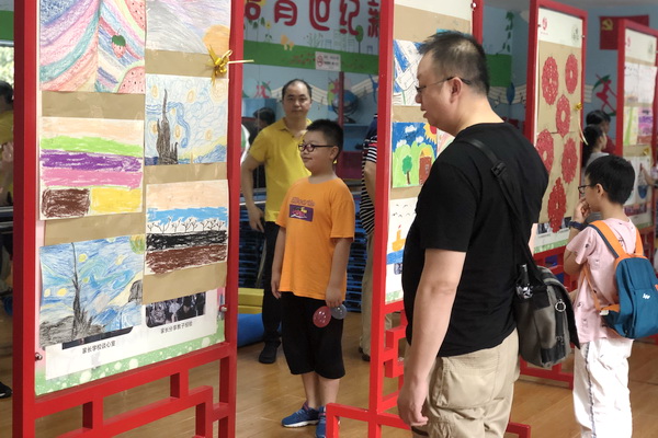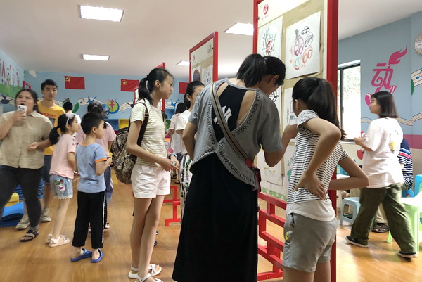 7月17日上午,同学们带领小朋友们学习传统艺术——中国彩墨画。通过亲笔作画尝试,孩子们领略了传统艺术的魅力。下午,志愿者老师带领同学们进行艺术实践活动——剪纸。孩子们用红色的方纸发挥想象力,创作出了各式各样或繁复或简洁的窗花,颇具喜庆氛围。