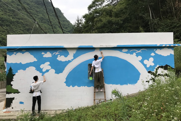 7月14日至18日,实践团每日往返3公里山路,为村口小平房绘制艺术墙绘。在墙绘过程中,城口时有下雨,但队员们不顾风雨,在条件允许的情况下,坚持冒雨绘制墙绘,将联丰村优美的自然环境和特色动植物结合起来,希望将此处打造成为联丰村的特色“打卡胜地”,增添联丰村的吸引力。墙绘的小平房是政府为联丰村两位贫困户修建的房屋,其中一位住户是90多岁的老兵,一位是曾经思想比较被动,总是“等、靠、要”,但经过扶贫工作人员实实在在的工作,转变了思想,开始主动寻求自强方法的村民。实践团成员的到来给两位老人的生活带来了一些活力,他们对实践团成员的墙绘工作也提供了一些帮助,还夸赞墙绘画得非常漂亮。