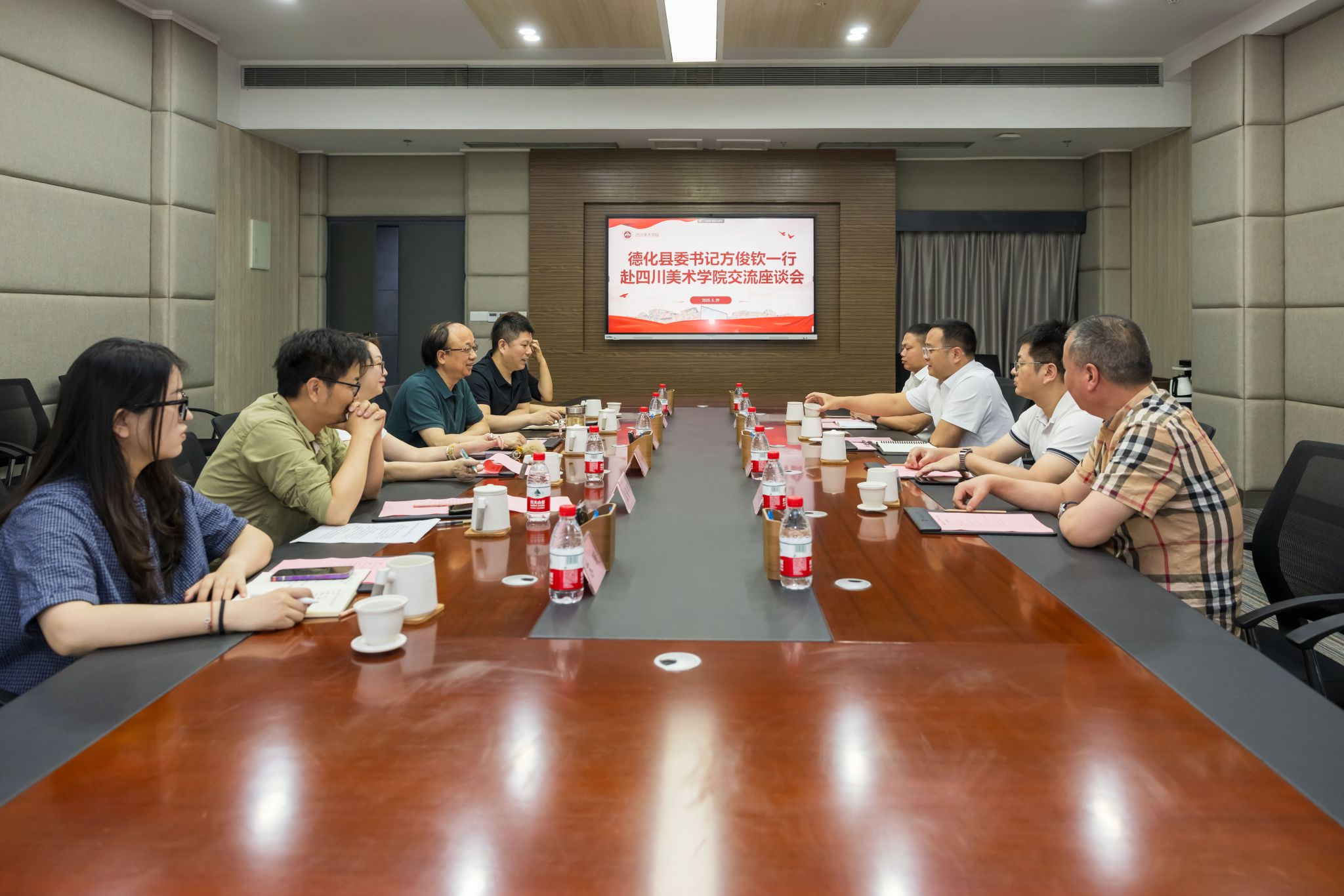 5月29日上午,福建省德化县委书记方俊钦一行来校调研交流。我校党委常委、副院长张勇华出席会议,党政办公室、创作科研处、设计学院负责人参会。