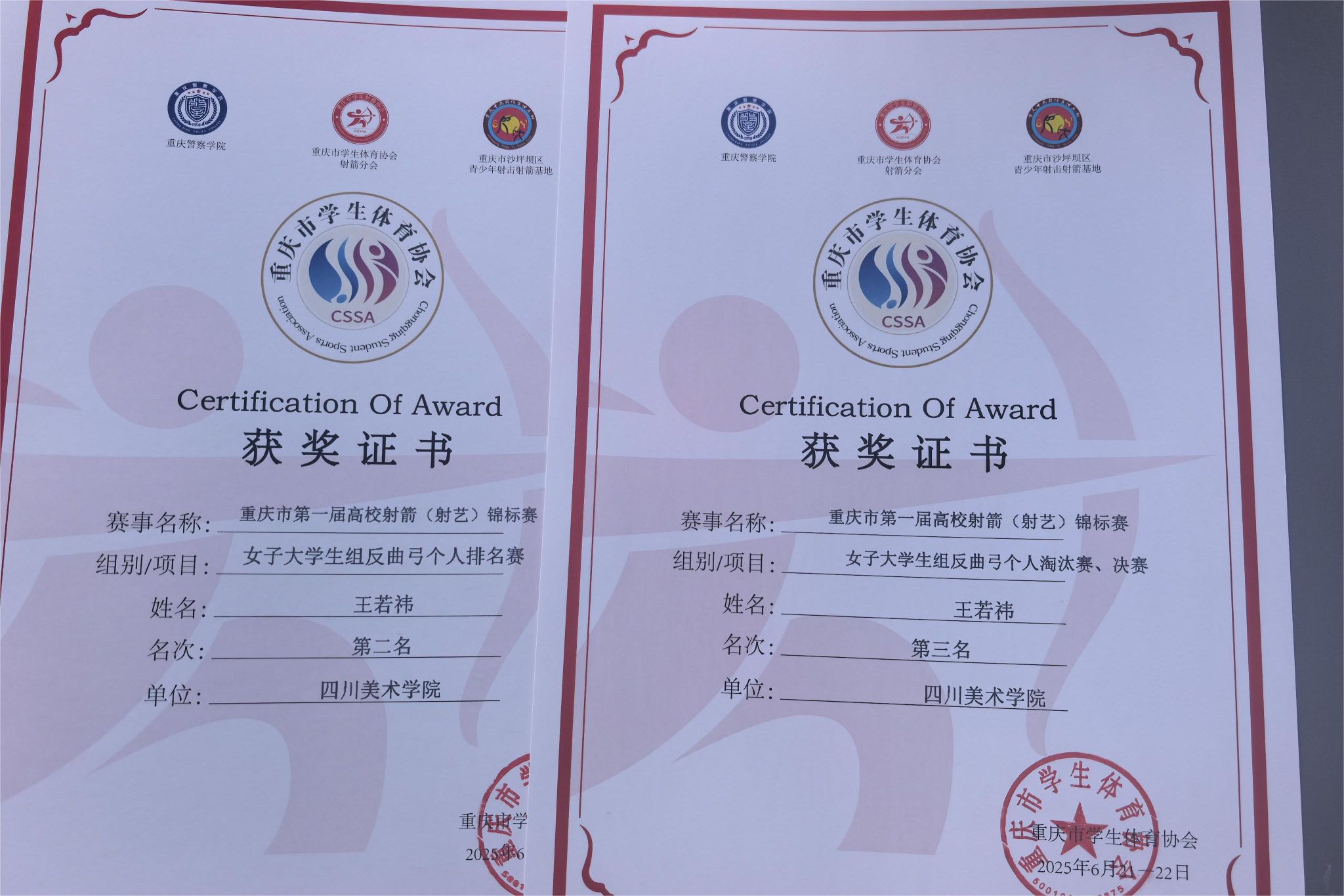 我校射箭队由通识学院体育教学部教师带队,2名运动员参加女子大学生组反曲弓排名赛和淘汰赛。尽管比赛当日暴雨绵延,但2位女运动员毫不退缩,以顽强意志与沉稳心态从容应战,充分彰显出川美学子锐意进取的精神风貌。凭借稳定发挥,一举荣获了2个第一名、1个第二名、1个第三名的优异成绩。