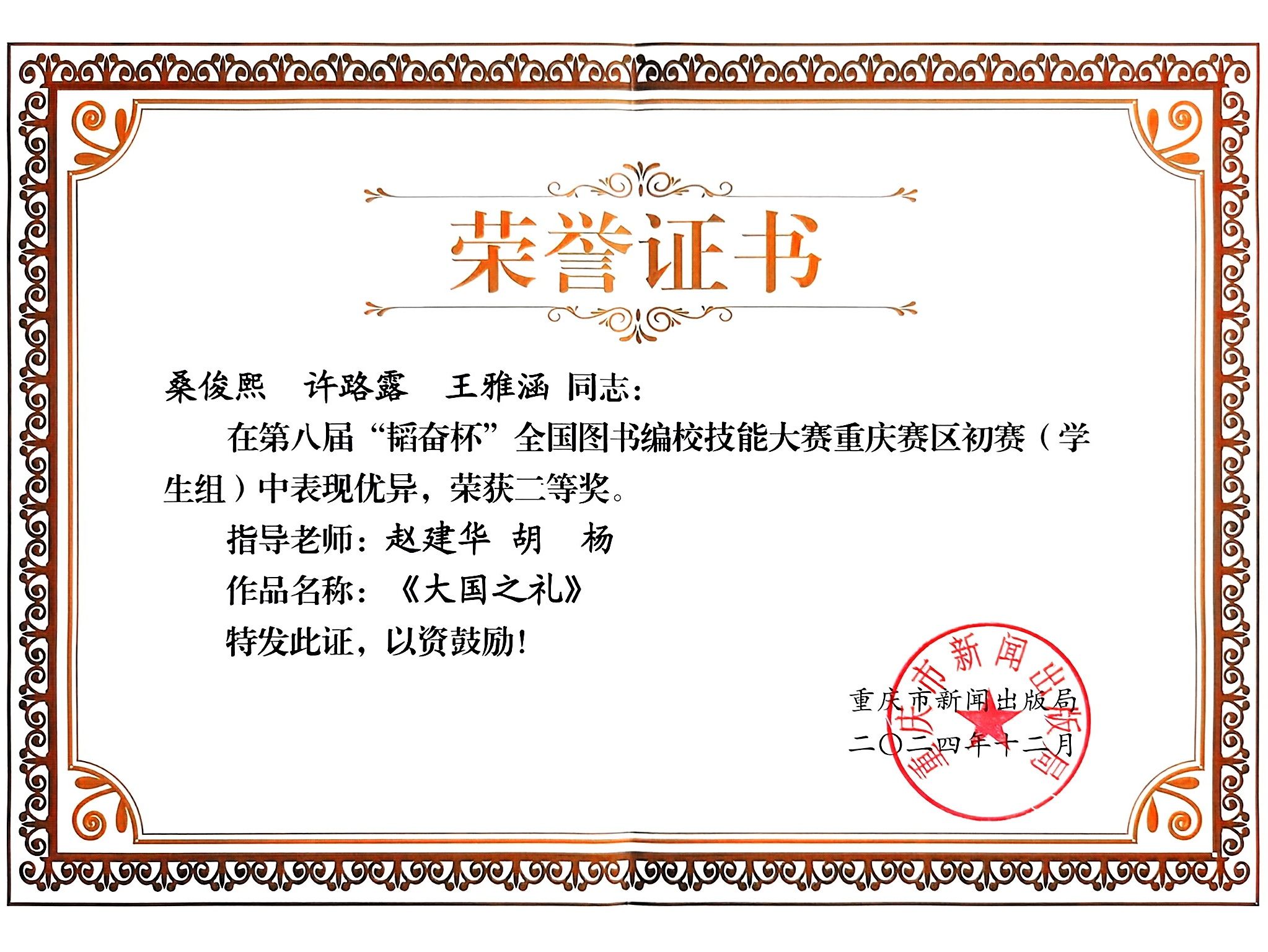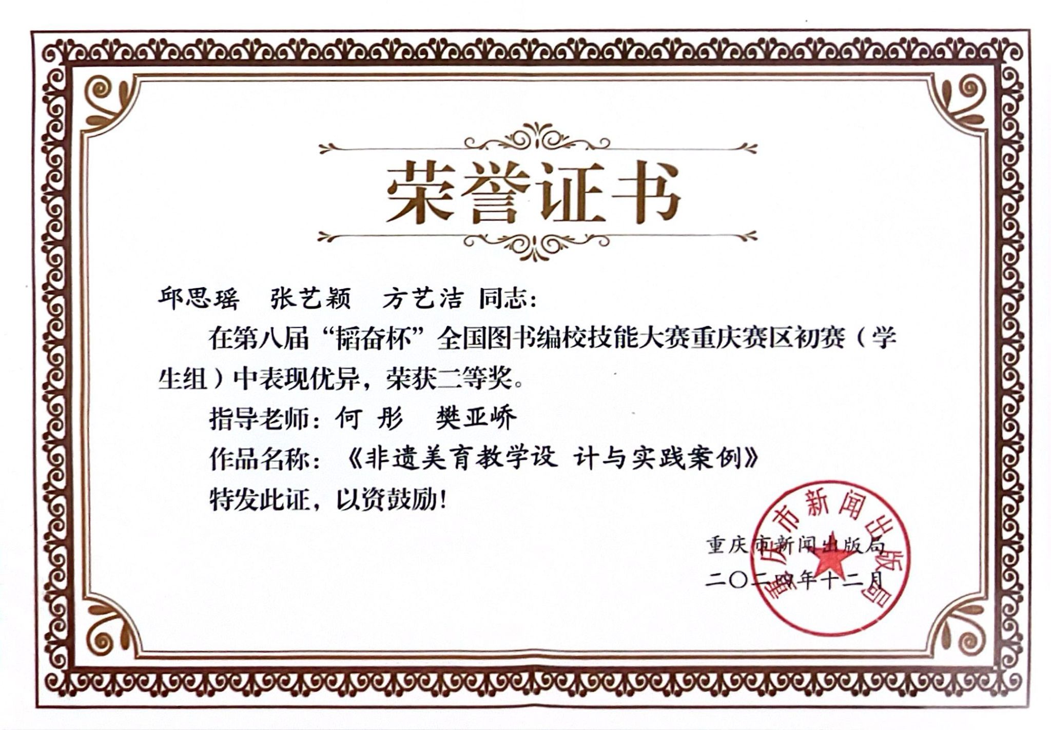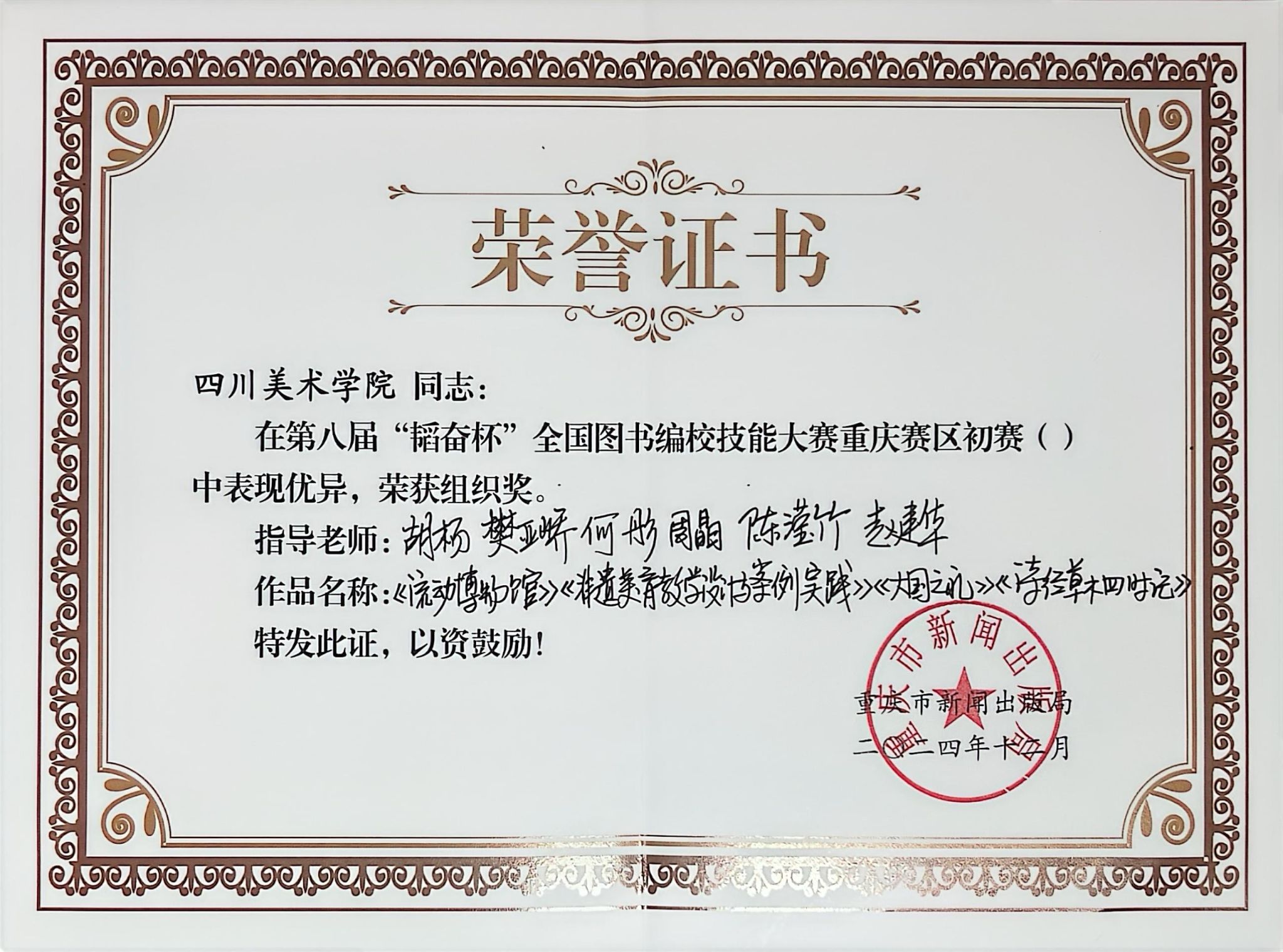 2024 年 8 月,国家新闻出版署发布赛事通知(国新出发〔2024〕13 号),重庆市新闻出版局于 10 月启动重庆赛区初赛。四川美术学院艺术教育学院组建 4 支队伍参赛,在重庆赛区初赛中获得1个一等奖、3个二等奖和优秀组织奖。其中,胡杨老师、赵建华老师带领的本科生团队《大国之礼》(桑俊熙、许路露、王雅涵)与何彤老师、樊亚峤老师带领的研究生团队《非遗美育教学设计与实践案例》(邱思瑶、张艺颖、方艺洁)两支队伍作为重庆代表队,于2024年12月26至27日赴北京参加全国决赛,与来自中国传媒大学、南开大学等全国30余所重点院校的研究生和本科生同场竞技,最终分获全国三等奖。