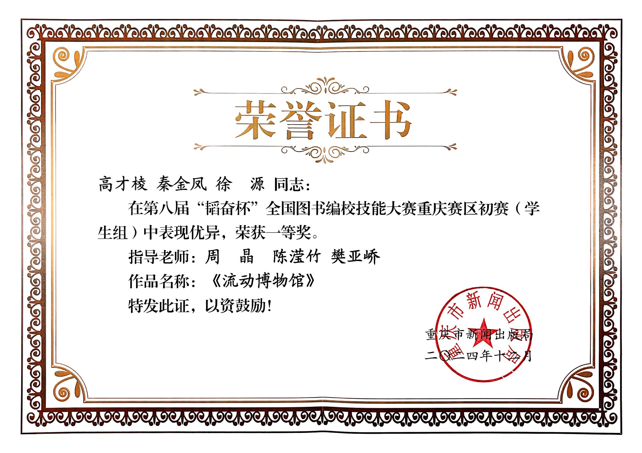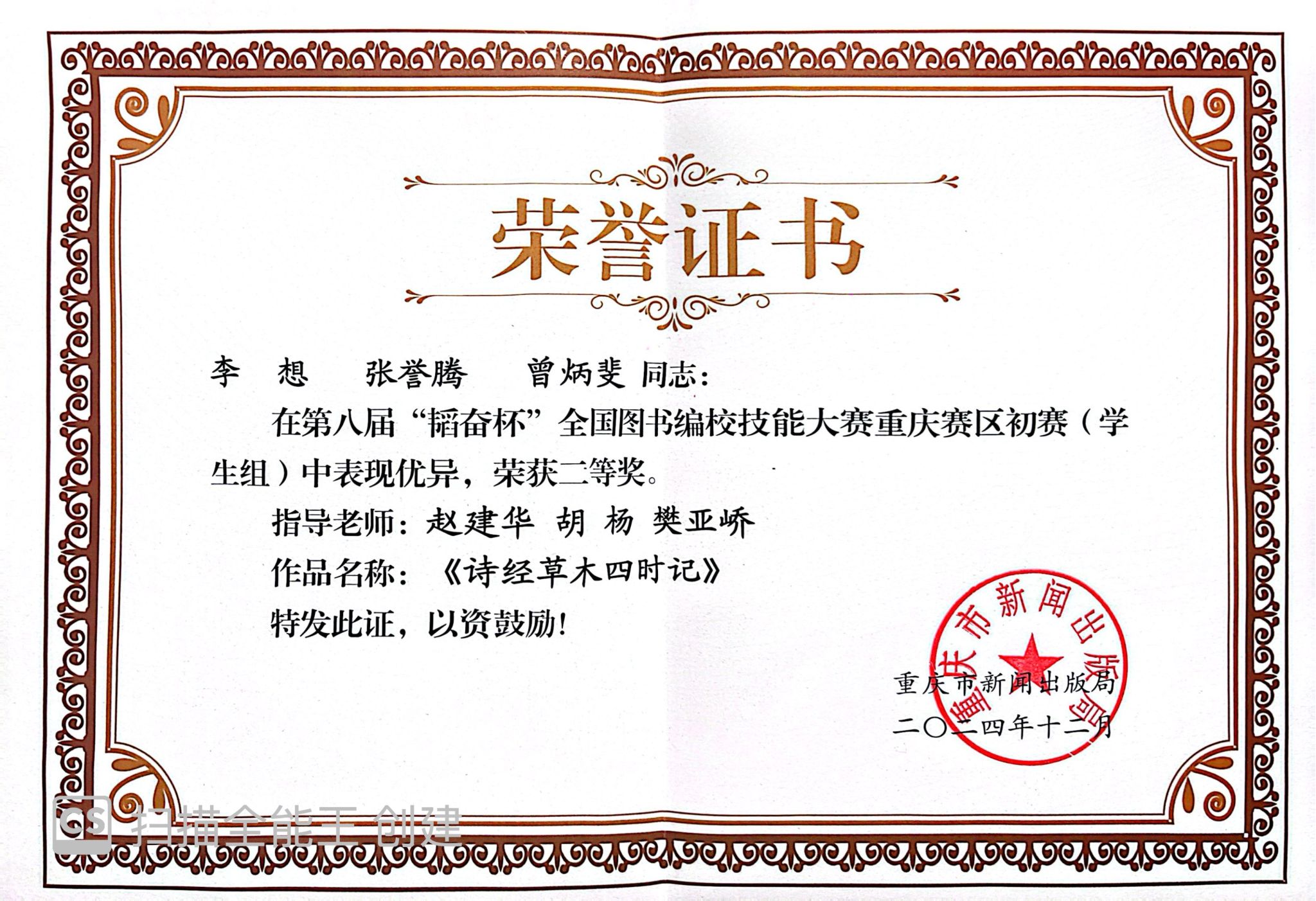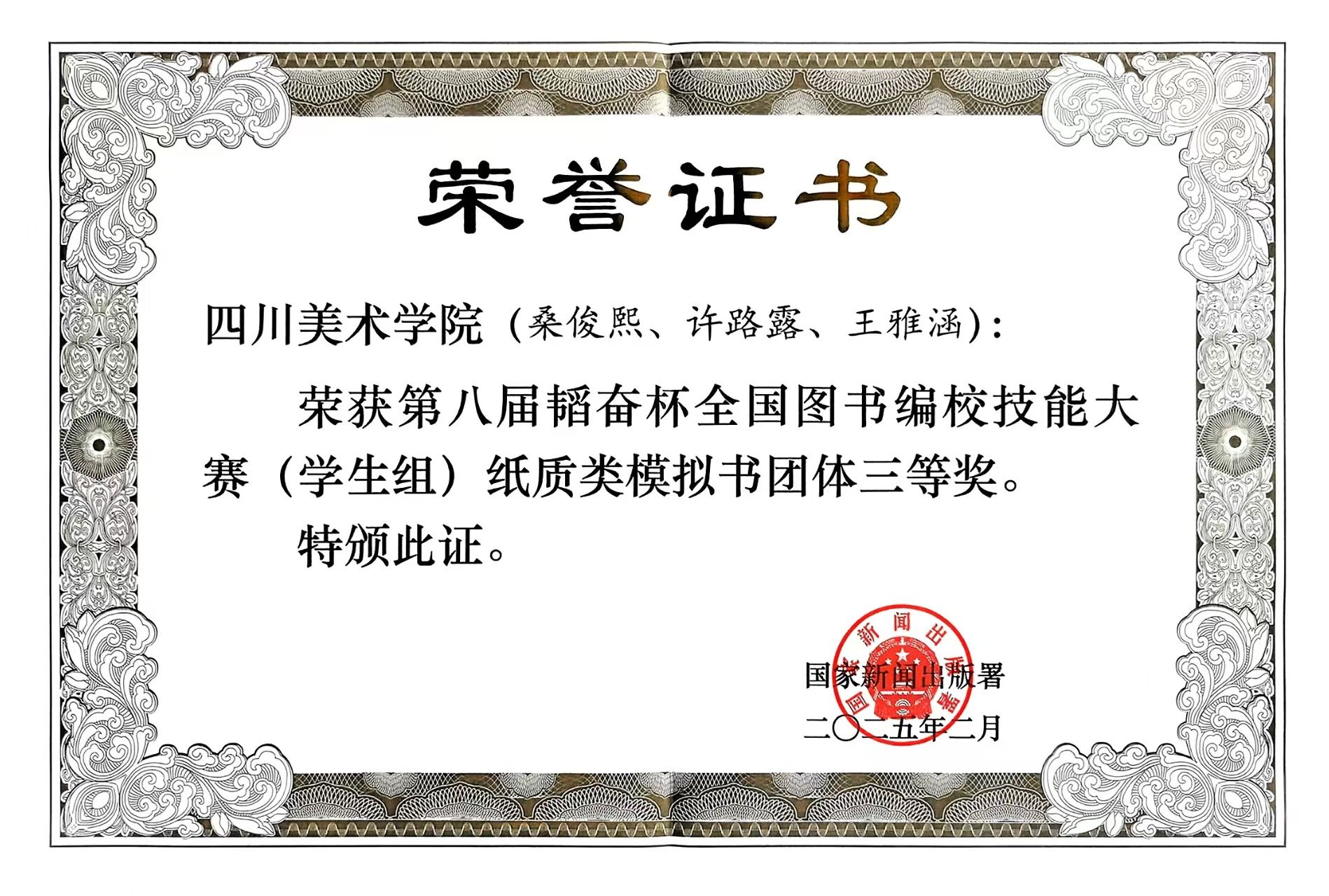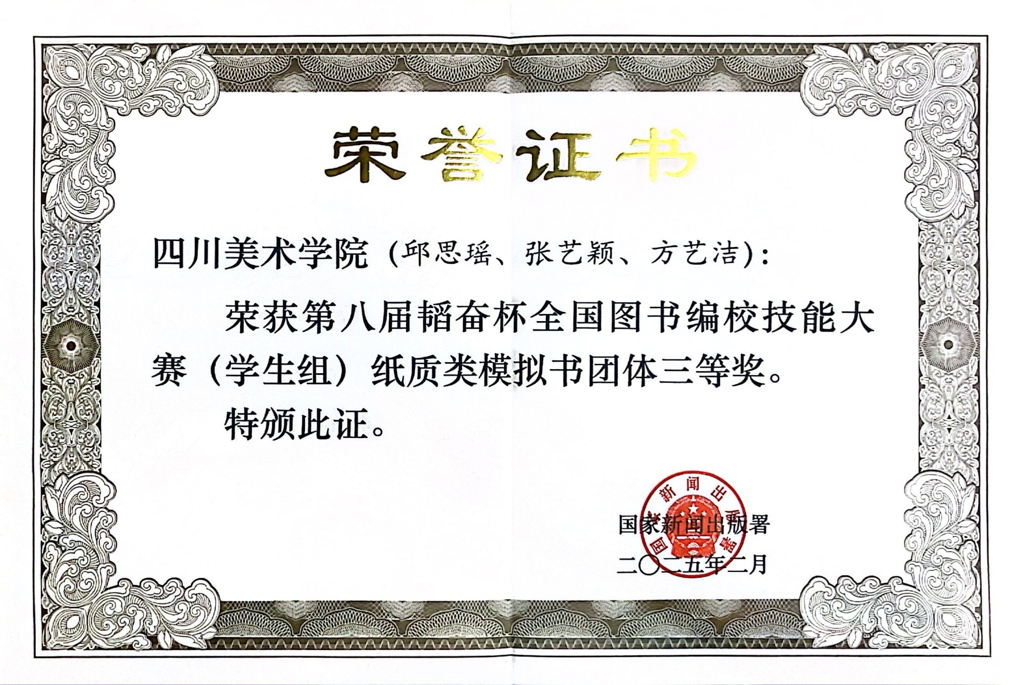 2024 年 8 月,国家新闻出版署发布赛事通知(国新出发〔2024〕13 号),重庆市新闻出版局于 10 月启动重庆赛区初赛。四川美术学院艺术教育学院组建 4 支队伍参赛,在重庆赛区初赛中获得1个一等奖、3个二等奖和优秀组织奖。其中,胡杨老师、赵建华老师带领的本科生团队《大国之礼》(桑俊熙、许路露、王雅涵)与何彤老师、樊亚峤老师带领的研究生团队《非遗美育教学设计与实践案例》(邱思瑶、张艺颖、方艺洁)两支队伍作为重庆代表队,于2024年12月26至27日赴北京参加全国决赛,与来自中国传媒大学、南开大学等全国30余所重点院校的研究生和本科生同场竞技,最终分获全国三等奖。